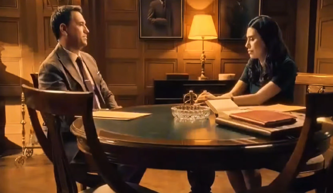 La cámara, en su habilidad para capturar las emociones más sutiles, enfoca los rostros de ambos personajes. Gabriel, acostumbrado a la confrontación y a la victoria, empieza a sentir la sombra de la duda. Sus cejas se fruncen ligeramente, su mirada se vuelve más inquisitiva. La calma inicial se evapora, reemplazada por una creciente inquietud. A su lado, María, con la gravedad de quien porta una pesada carga, se prepara para desvelar la oscuridad que acecha.